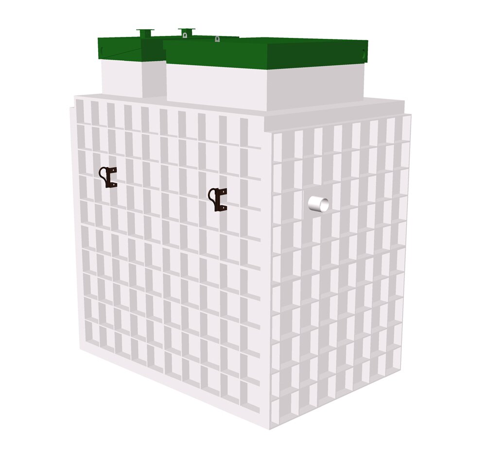 Локальное очистное сооружение, которое редко устанавливается на загородный дом. Чаще всего это группа домов или строение рассчитанное на проживание нескольких семей, ведь собрать до 20 человек по одной крышей, которые при этом полноценно будут пользоваться сантехническими приборами достаточно проблематично. Но есть конечно исключения ввиде больших семей или коттеджей, где установлены большие потребители воды (джакузи, купели). Пиковый сброс данной станции рассчитан на 1000 литров и суточный объём который она может переработать не превышает 4 кубов. На поверхности земли будут возвышаться две горловины зелёного цвета.